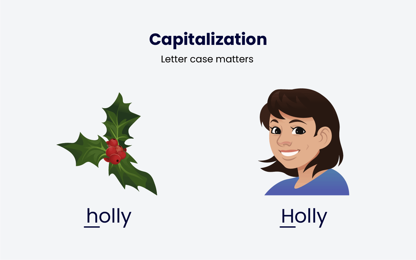 Letter case is part of spelling, so capitalization matters (as in holly & Holly; china & China).