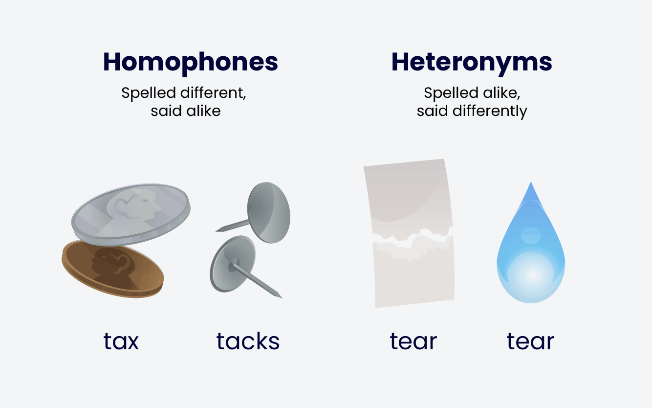 English also has a number of heteronyms, words that are spelled alike but have different pronunciations and meanings (such as tear meaning "rip" and tear meaning "liquid from the eye").