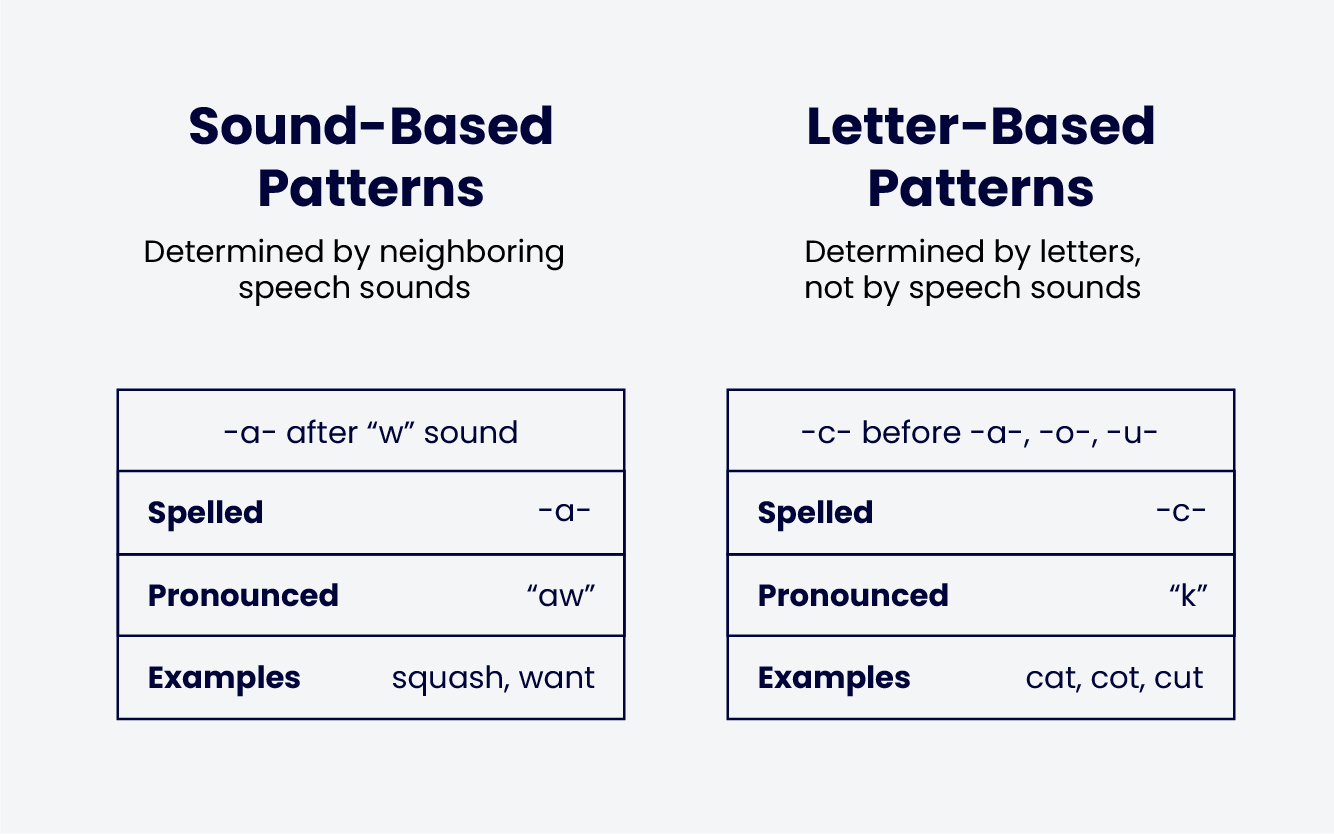 There are sound-based patterns, such as the pattern that predicts that -a- will be pronounced "aw" when it comes after the "w" sound (as in want and squash).