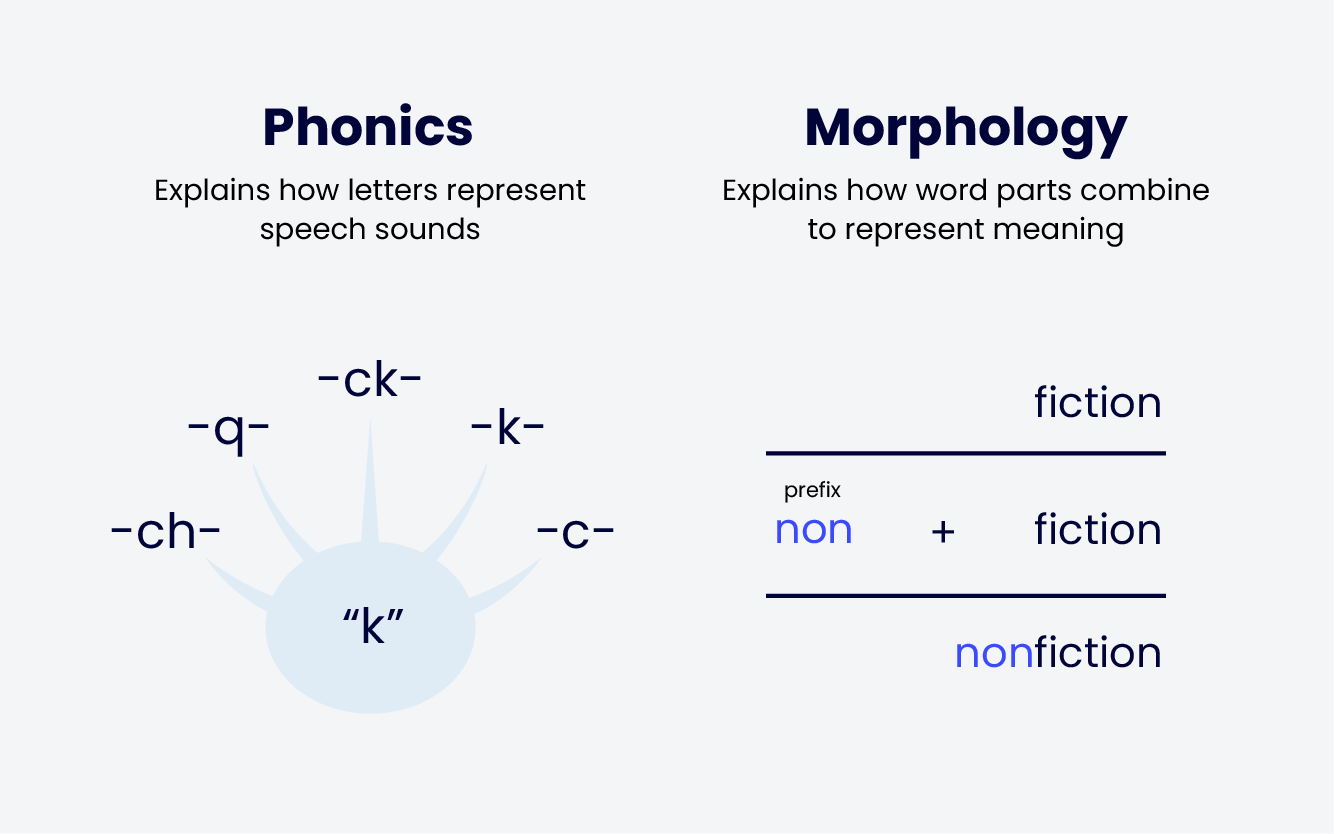English spelling uses both phonics (how letters represent speech sounds) and morphology (how word parts combine to represent meaning, like how the prefix non- changes the meaning of a word).