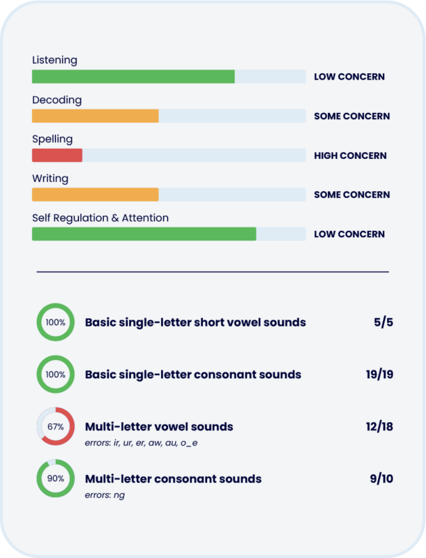 Whether your child is struggling, keeping up, or somewhere in between, our in-depth Reading and Spelling Inventory gives you a clearer understanding of what they’ve learned and where they may need help. It’s ideal to: